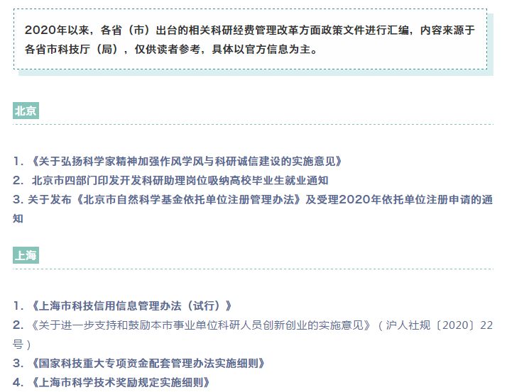 2020年以來,各?。ㄊ校┏雠_的相關(guān)科研經(jīng)費管理改革方面政策文件進行匯編,內(nèi)容來源于各省市科技廳(局),僅供讀者參考,具體以官方信息為主。北京1. 《關(guān)于弘揚科學(xué)家精神加強作風(fēng)學(xué)風(fēng)與科研誠信...